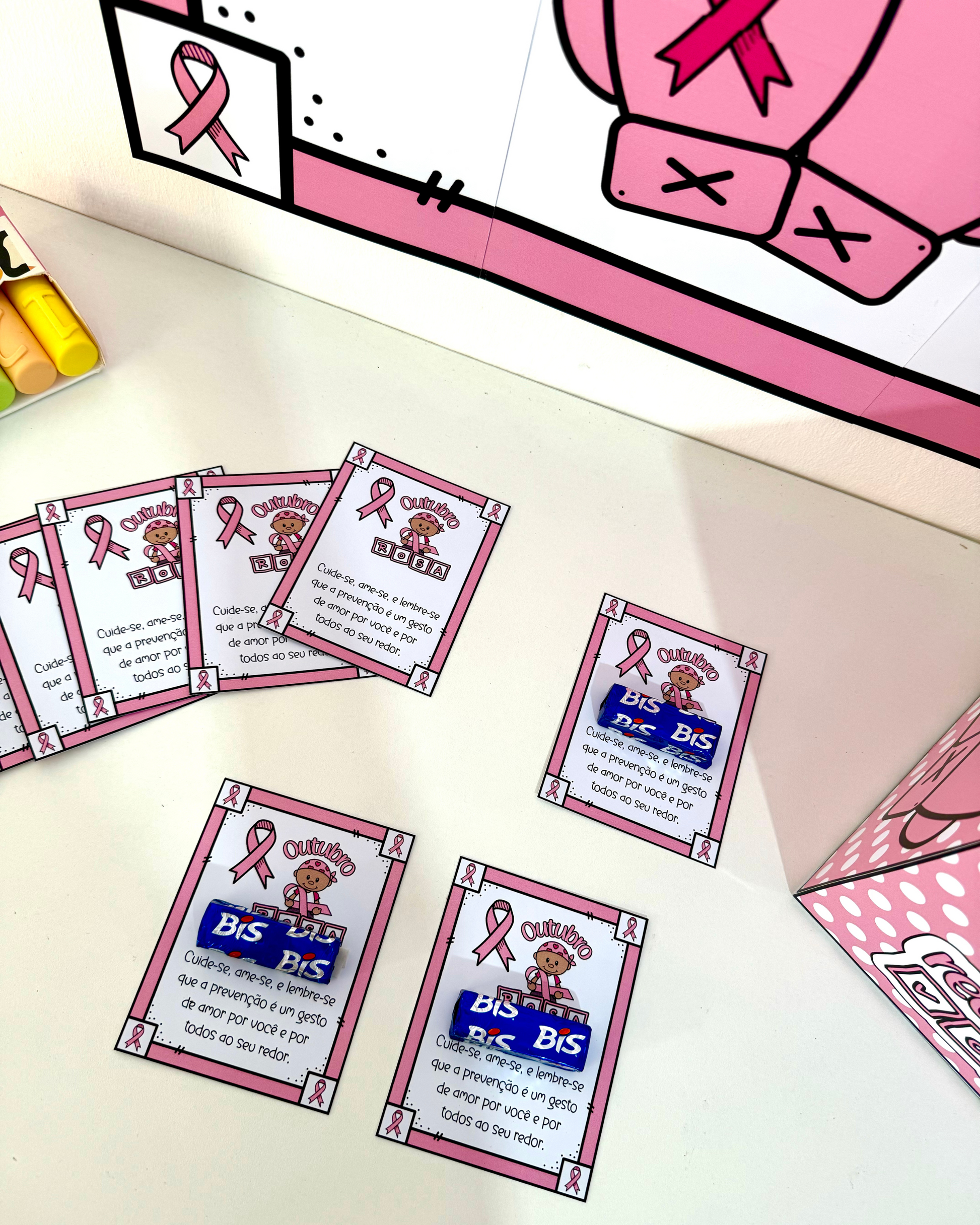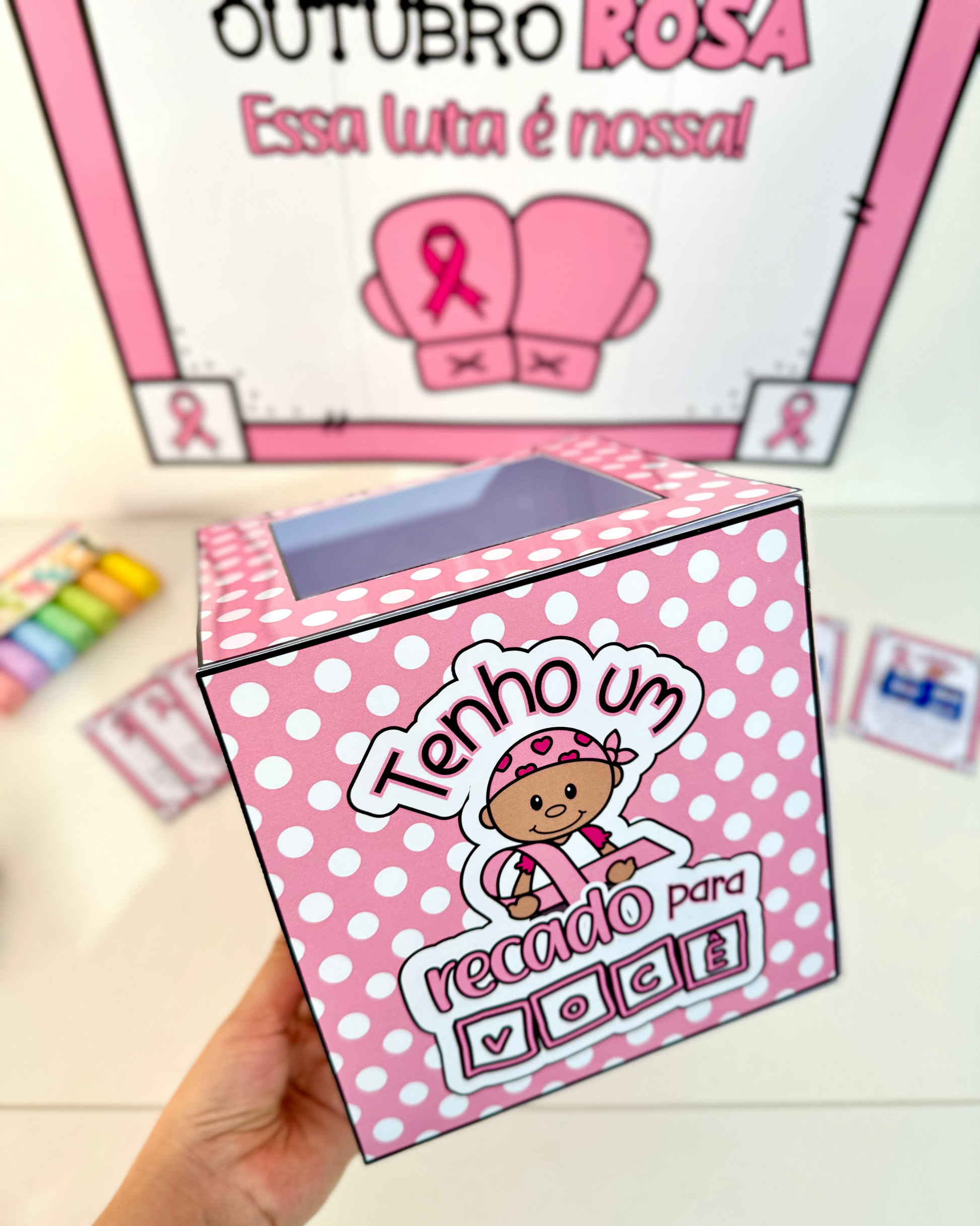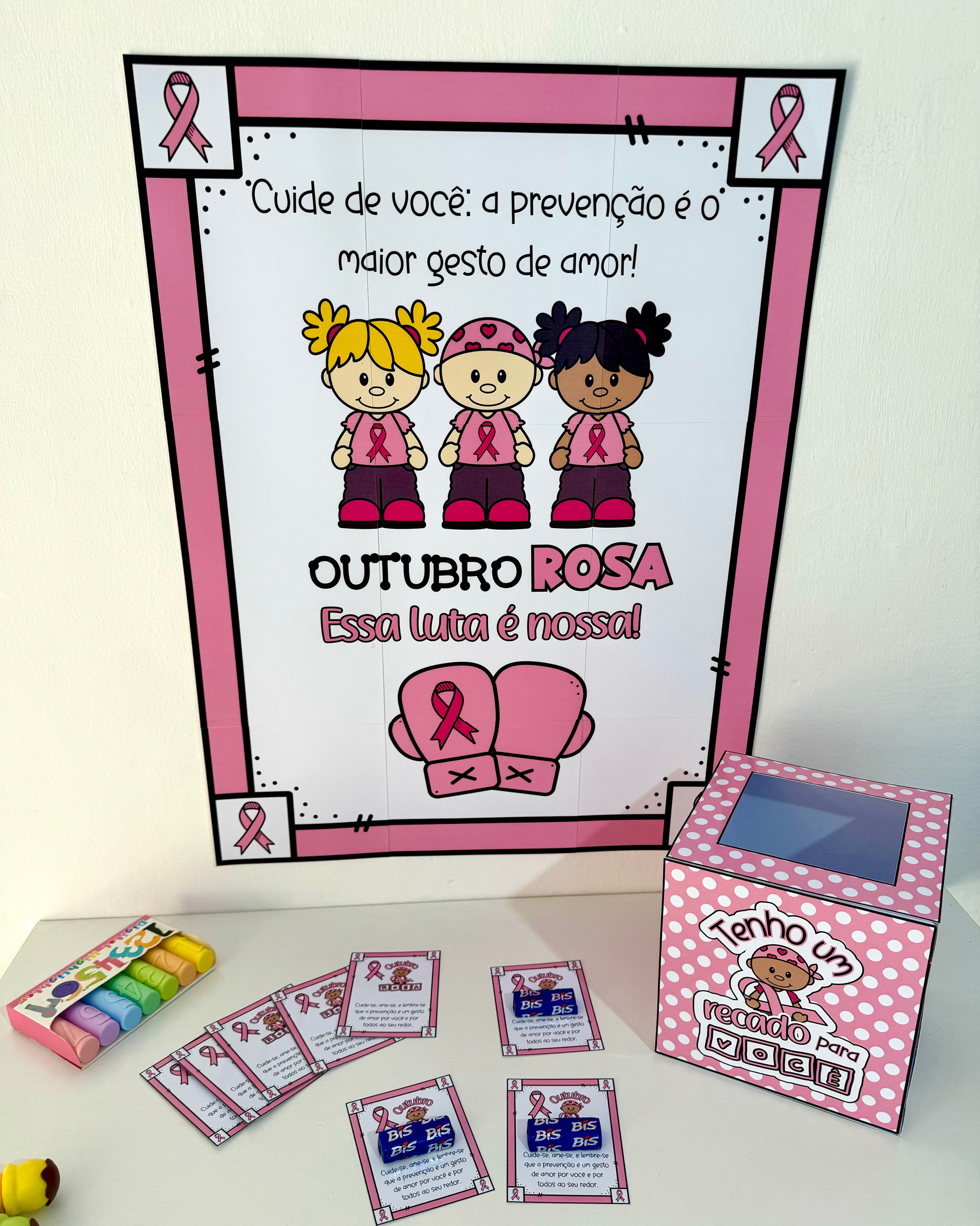Cartaz, caixa e lembrancinhas para Outubro Rosa